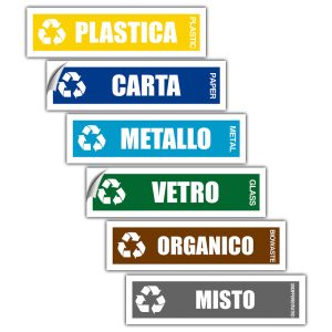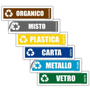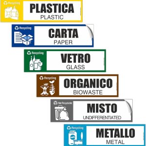 6 Adesivi Raccolta Differenziata 15x4 cm – PVC Morbido Impermeabile Lavabile – Etichette Riciclo Rifiuti in Italiano e Inglese