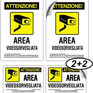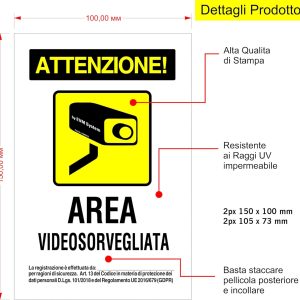 4 Cartelli Adesivi Area Videosorvegliata Impermeabili in PVC Morbido – 2 Grandi (100x150 mm) + 2 Piccoli (105x73 mm) – Uso Interno ed Esterno