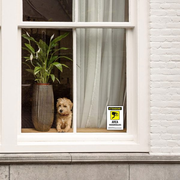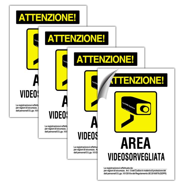 Set di 4 cartelli adesivi “Area Videosorvegliata” in PVC morbido impermeabile, formato 100×150 mm. Protetti dai raggi UV, resistenti alle intemperie e anti-scolorimento, ideali per porte, vetrine, cancelli e superfici lisce. Facili da applicare senza attrezzi per uso interno ed esterno
