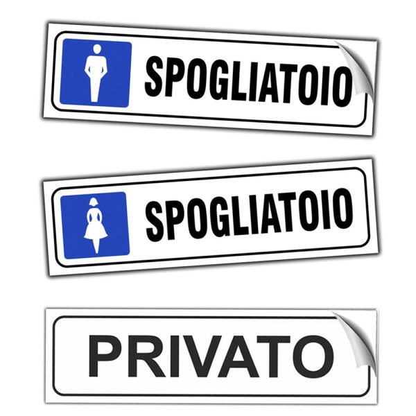 Set di 3 etichette adesive “Spogliatoio Uomo / Donna / Privato” in PVC morbido laminato opaco, formato 15×40 mm. Impermeabili, lavabili, anti-riflesso e protette dai raggi solari (UV), perfette per segnalare gli spazi spogliatoio e aree riservate su porte di uffici, palestre, locali e strutture pubbliche/privati. Facili da applicare senza attrezzi, per uso interno ed esterno