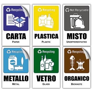 • 6 Adesivi Raccolta Differenziata in PVC Morbido Impermeabile – 15×4 cm Italiano e Inglese Protetti UV Anti-Scolorimento